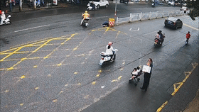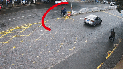 近日,在赣州会昌县城红旗大道,一名戴头盔的男子在过马路时突发疾病,倒在车来车往的道路中央。危急之时,一位红衣男子出现了。